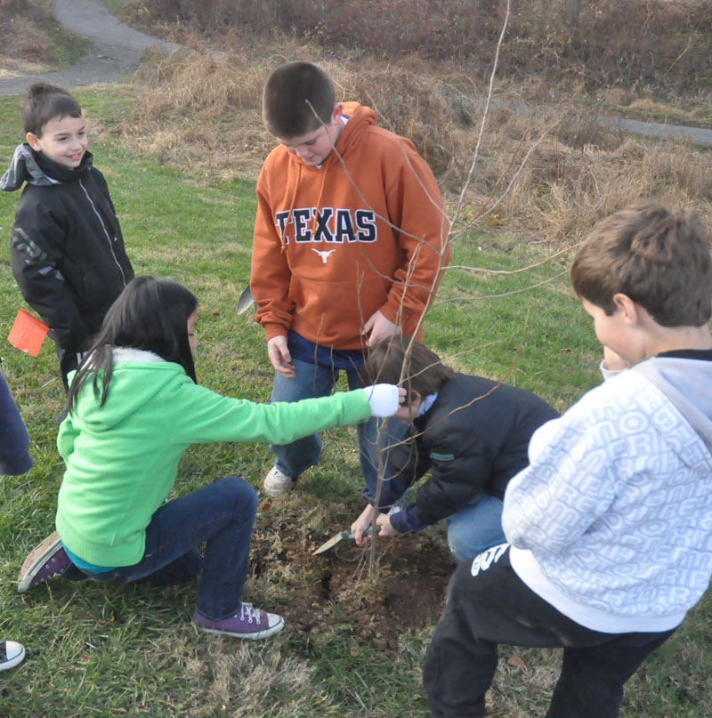 First, second, fourth and fifth grade students at Pocopson Elementary School worked together to plant some 250 trees along the campus' new walking trail, as part of a joint project with the Stroud Water Research Center.—Mike McGann photos