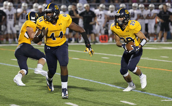 Unionville senior running back Brandon Boon (29) with fullback Bryce McManus (44) leading the way hits the line, Friday night. Boon rushed for 222 yards and a pair of TD in Unionville’s 37-13 win over Garnet Valley. Jim Gill Photo.
