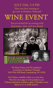 NEW GARDEN — Kennett Square Area local folk band The Rose Project invites you to a great night of local music, fun, food, and wine at Paradocx Vineyard on July 25th from 5-9pm. Downingtown band The Jayplayers will be opening at 5:15 and The Rose Project will perform music from their first recorded album beginning at 6:30. Tickets can be purchased online or at the door. $10 admission includes a glass...
