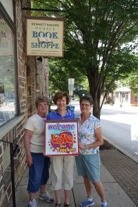 (l-r)Volunteers Pat Blades, Carol Antes, and Karen Martin hold out a welcome sign for the August 29 Teacher Appreciation Sale at the Kennett Square Resale Book Shoppe at 113 S. Union Street.