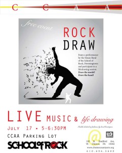 Another unique art opportunity is Chester County Art Association’s RockDraw, a free concert and life drawing session also on Thursday July 17th from 5pm – 6:30pm in the Chester County Art Association’s parking lot in West Chester. The House Band of the School of Rock in Downingtown will perform for free, while models pose in clothes from fabulous local clothing boutiques. What a cool idea! So come just for fun to see the artists sketching, the models showing fashion, or the students playing their music..or grab a sketchpad and start sketching away at this great open air RockDraw session.