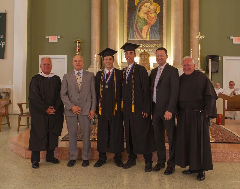 The presentation of the Kevin J. Fitzpatrick ’81 Senior Class Award to Nick Parente of Lincoln University (second from right) and Brian Rawlins of West Chester (third from right). At left are Steve Valyo ’70, Assistant Head of School, and Christian Talbot, Head of School. At right is the Rev. Jim Flynn, O.S.A., President.