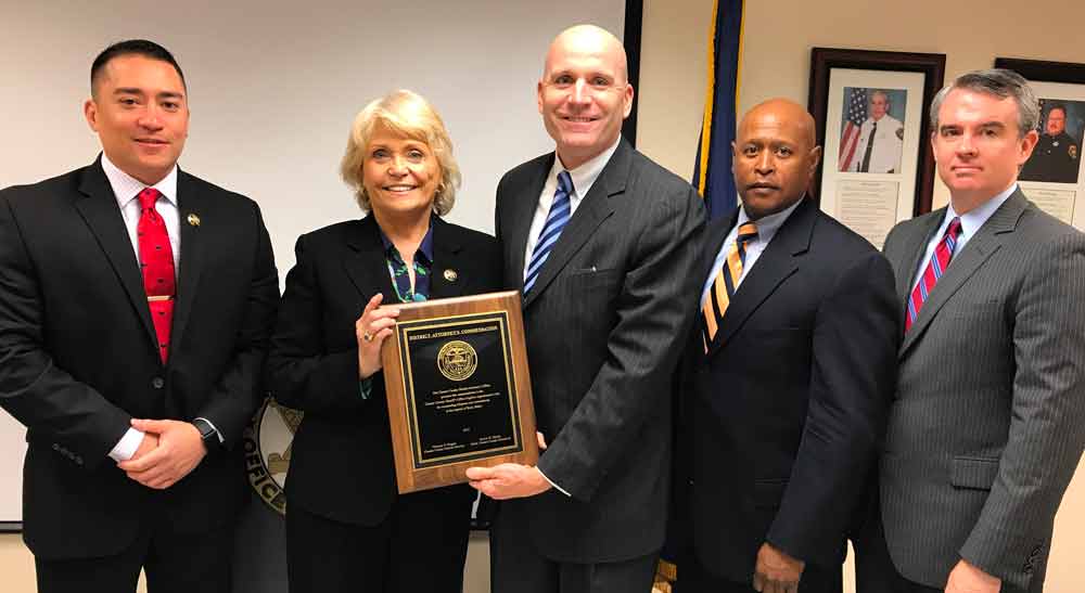 Chester County Sheriff Carolyn ‘Bunny’ Welsh (second left) holds the commendation presented by Chester County District Attorney Tom Hogan (center). She is also joined by (from left to right) Chief Deputy Jason Suydam, Chief Deputy Kevin Dykes and First Assistant District Attorney Michael Noone.