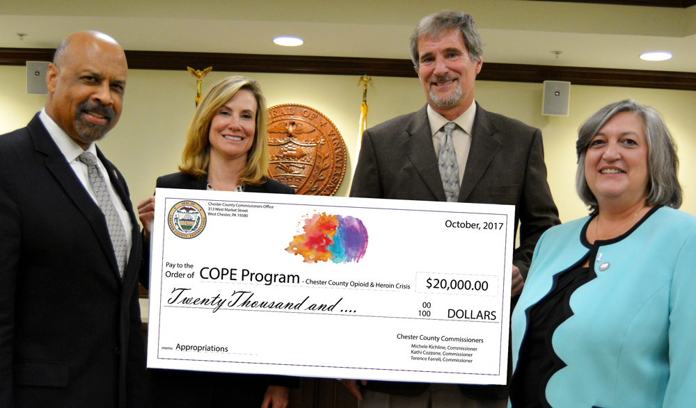 The $20,000, which is part of the Commissioners’ appropriations funds, will support the County’s new Community Outreach and Prevention Education (COPE) initiative, borne out of the Chester County Overdose Prevention Task Force. COPE will provide one-to-one support for overdose survivors and their families and friends; provide overdose prevention information and outreach to first responders, hospital staff, family members and friends; and importantly, provide expedited admission into detox and a review of all treatment options for overdose survivors who agree to treatment.