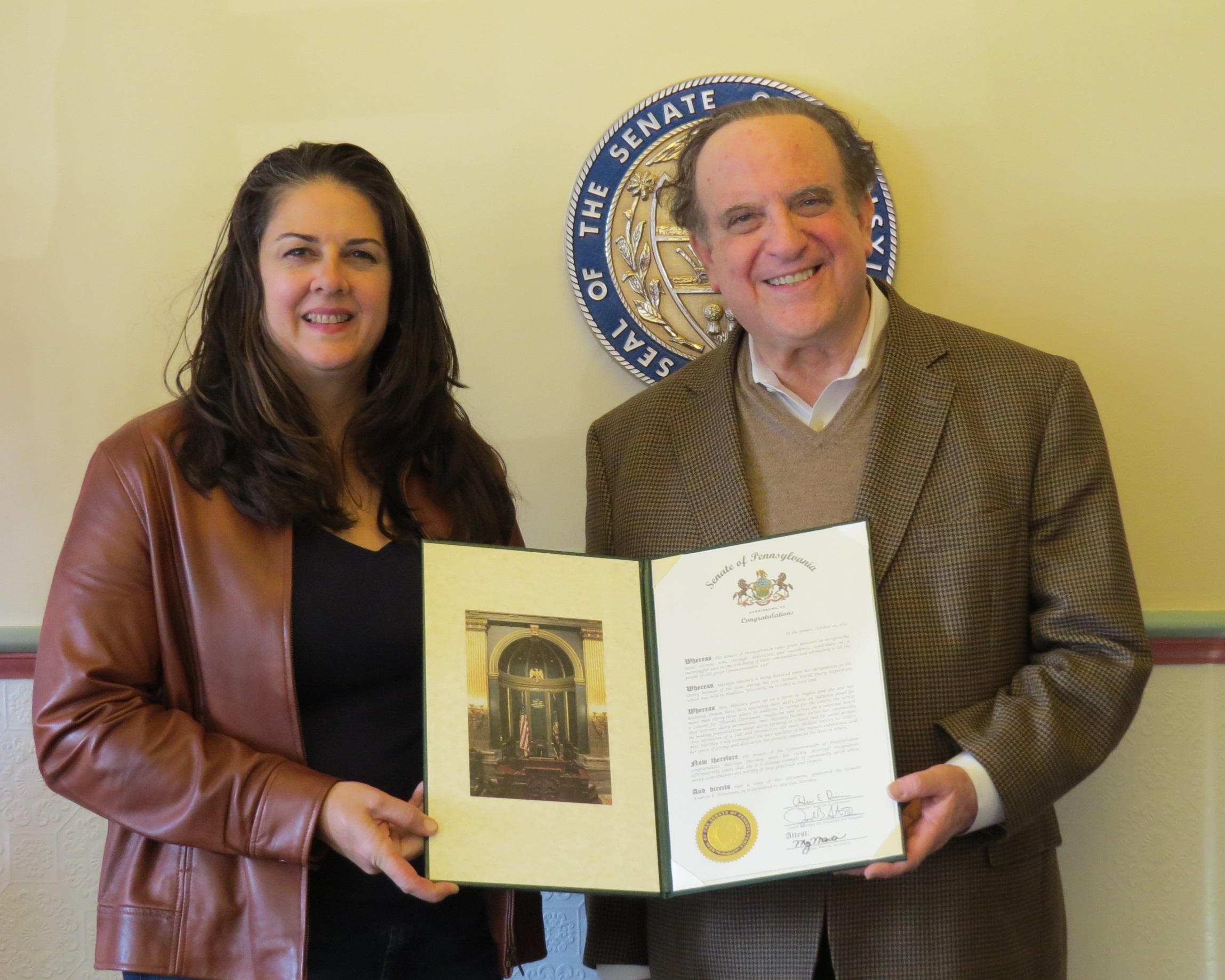 State Senator Andy Dinniman recently recognized Marilyn Hershey on being named Dairy Woman of the Year at the 51st Annual World Dairy Exposition.