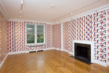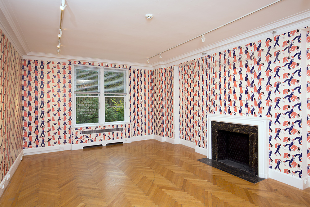 As I scrolled through the participating artists on the Main Line Art Center website, I stumbled upon Nick Cassway whose computer drafted stencils create a manufactured style of to his illustration. One of his recent projects, “Above The Sound of Ideologies Clashing,” finds an entire room covered in his illustrated wallpaper.