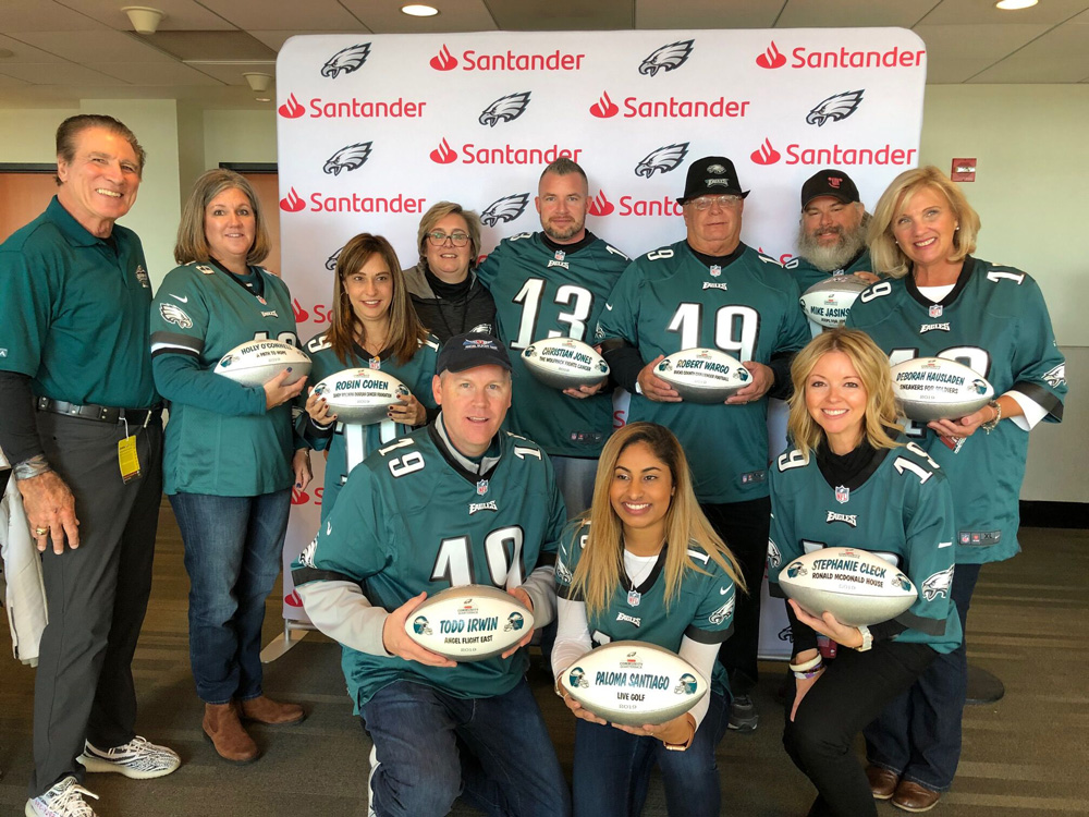 Mike was recognized for his work as President of Jeeps for Joy, an organization that helps complete the wish lists of local children’s hospitals and Ronald McDonald Houses. In addition, they donate rides on Jeeps and organize a Build-A-Bear event each year to build and deliver bears to local hospitals. Honorees received a VIP gameday experience that included watching the Eagles take on Chicago from the Santander Field Club located in the end zone at the Eagles football stadium. Santander donated $15,000 to local non-profit organizations, including a $500 donation for Jasinski’s non-profit organization of choice as part of the Community Quarterback program.