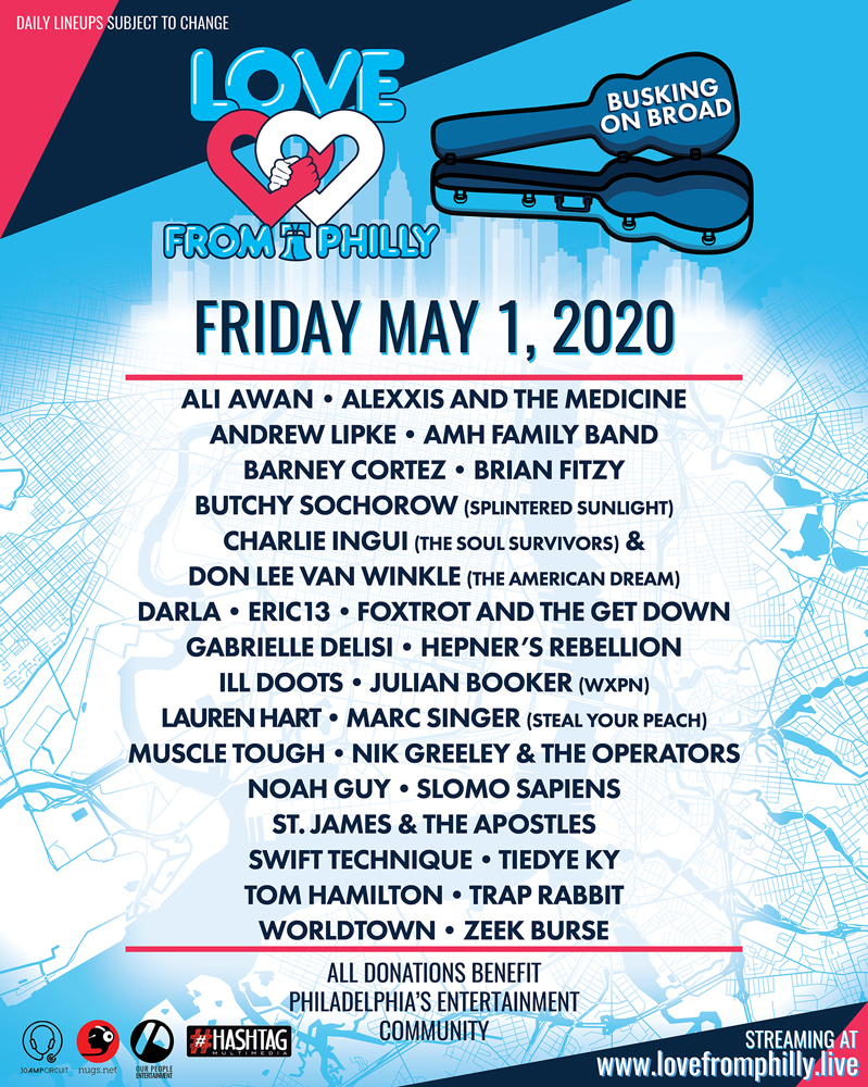 The festival will livestream at lovefromphilly.love in conjunction with nugs.net. Artists to perform from home via livestream each day are as follows with set times to be announced shortly: