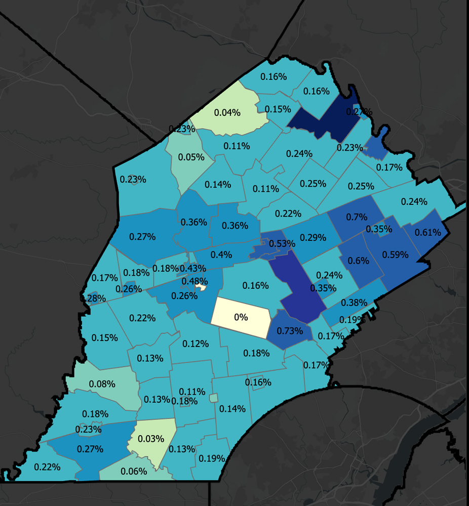 The latest map of COVID-19 cases from the Chester County Health department as of May 6. Darker areas mean more cases.