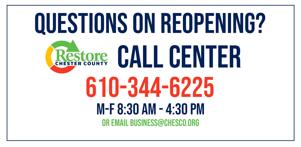 WEST CHESTER — As Chester County begins its green phase of operation during the COVID-19 pandemic, County officials have added a call center service for business and resident questions on reopening guidelines and practices. Part of the “Restore Chester County” initiative, the call center is operated by Chester County Health Department staff, with input from members of the County Commissioners’ COVID-19 Business Task Force.