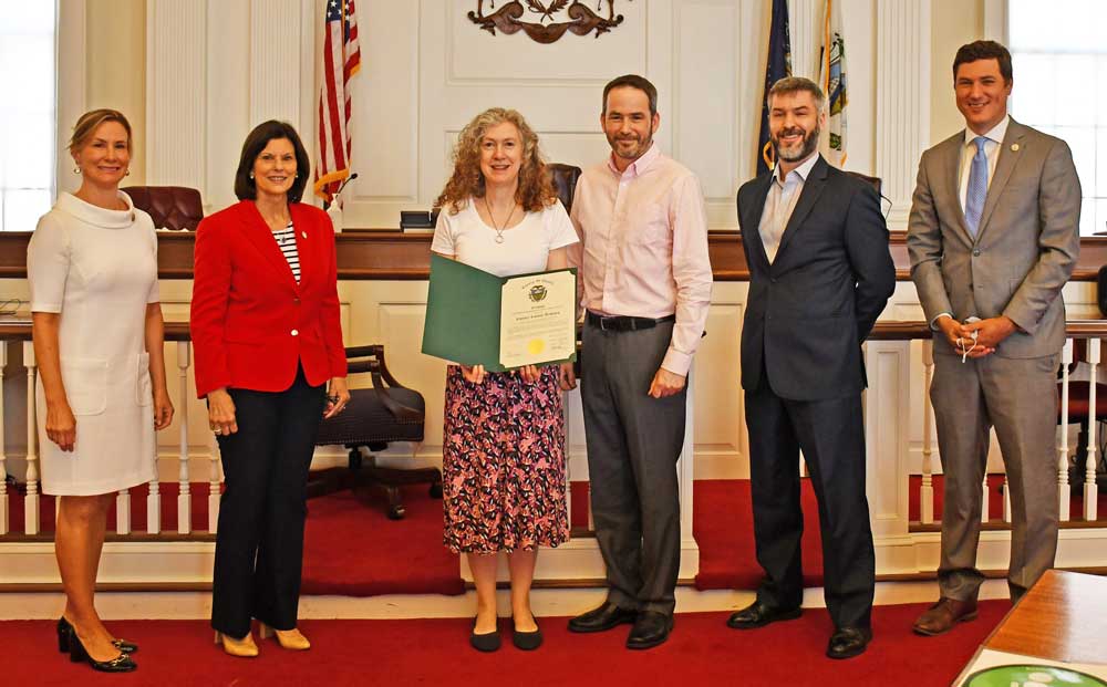 The Chester County Commissioners recognized the efforts of the County’s Archives staff to earn a National Genealogical Society award for the County’s 1777 Property Atlas Portal, at today’s first in-person public meeting since the start of the pandemic. Pictured left to right are: Commissioners Michelle Kichline and Marian Moskowitz; Laurie Rofini, Director of Chester County Archives & Record Services; Cliff Parker, Chester County Archivist; Conor Hepp, President of the Chester County History Center; and Commissioner Josh Maxwell.