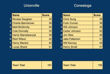 The Unionville boys varsity golf team played Conestoga Tuesday.  The match result was: