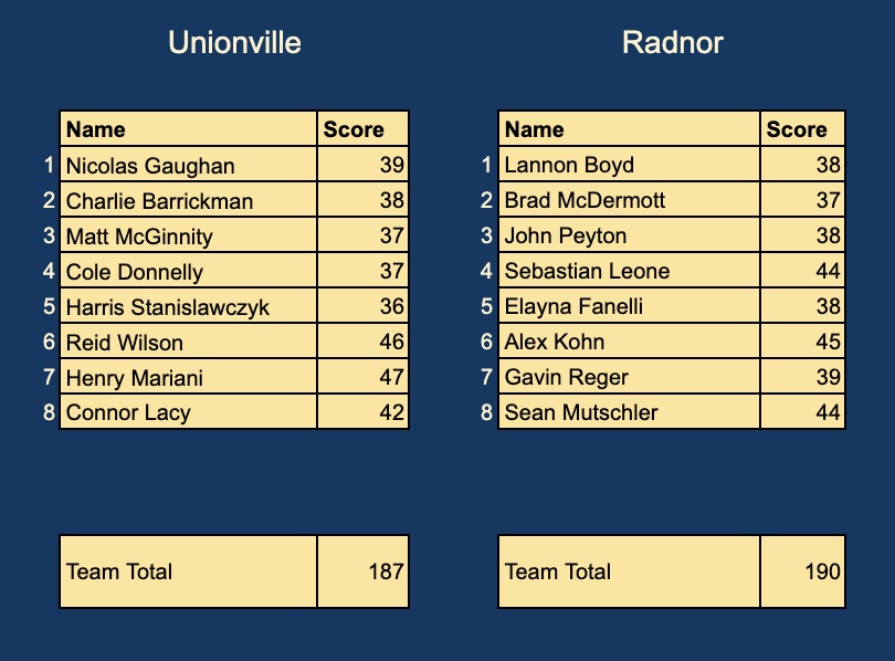 The Unionville boys varsity golf team played District 1 powerhouse Radnor HS Wednesday. The match result was: