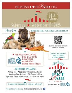 The 14th Annual Pottstown Pet Fair 2022 (75 West King Street, Pottstown, www.facebook.com/funforyourpets) will take place on September 13.The event, which runs from 10 a.m.-2 p.m., will feature a gathering of animal rescues, pet-care businesses and animal wellness organizations for a day of fun and community fellowship in Pottstown’s Memorial Park.