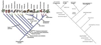 Figure 2: Cladograms of the relationships of animals listing the “derived traits” (also known as synapomorphies) that gave rise to animal phyla (left) and great apes (right). All great apes lack long tails; chimpanzees, gorillas and humans are extant, but the others are extinct. For both cladograms, time is on the Y axis with the most recent at the top and the most ancient at the bottom (not to scale). Figures are reproduced under fair use.