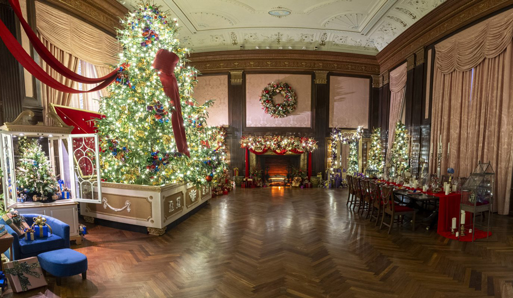 The Silver Garden features a living tree and luminous living wreaths. The Ballroom shines with community spirit, where glittering trees are decorated by local art centers.
